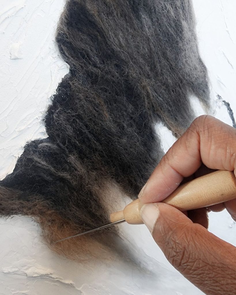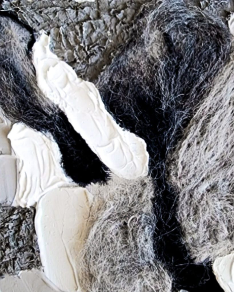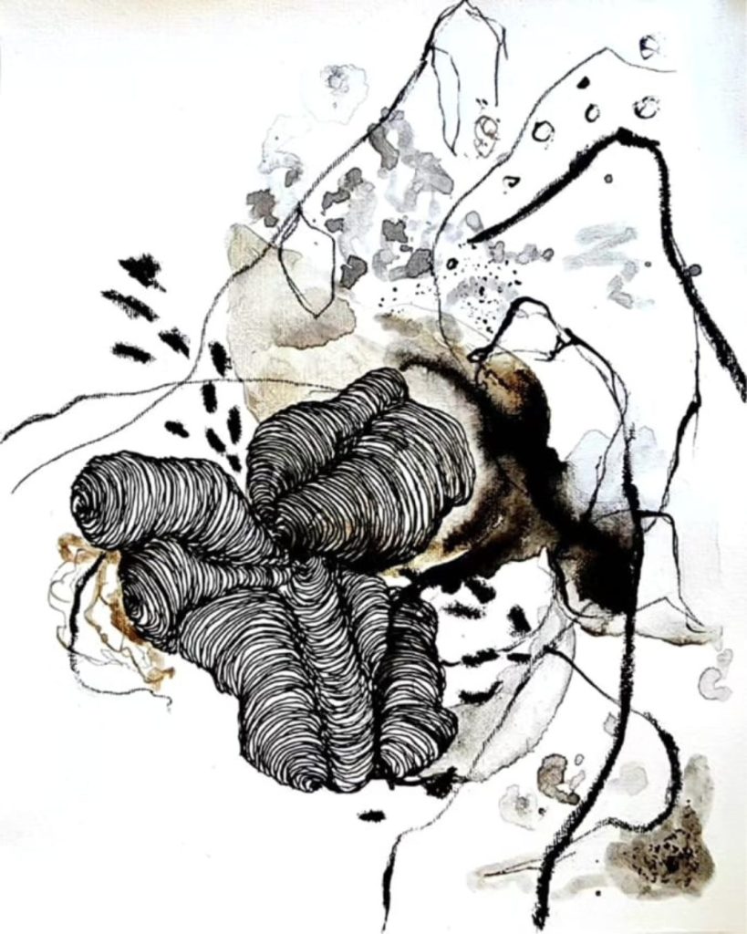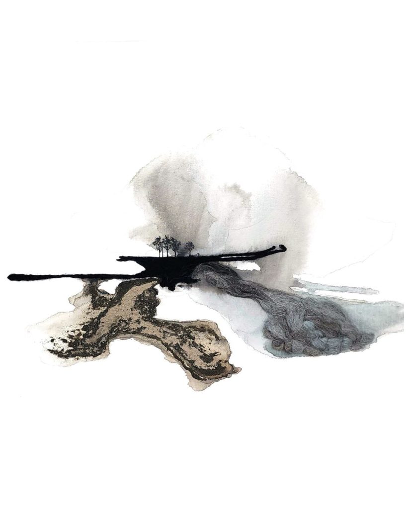 I use materials that invite the unknown; ink that drips unpredictably, wool that shifts with moisture, layers of cold wax that blur the line between shape and shadow.